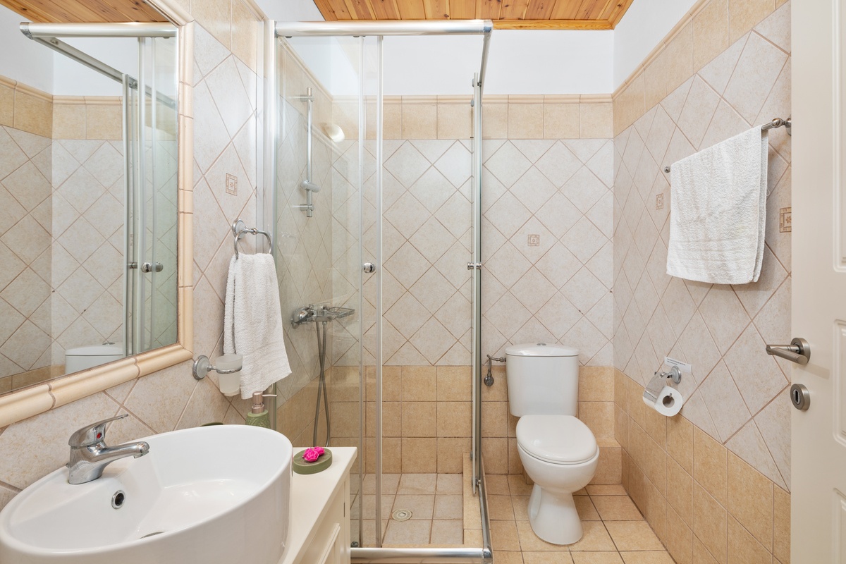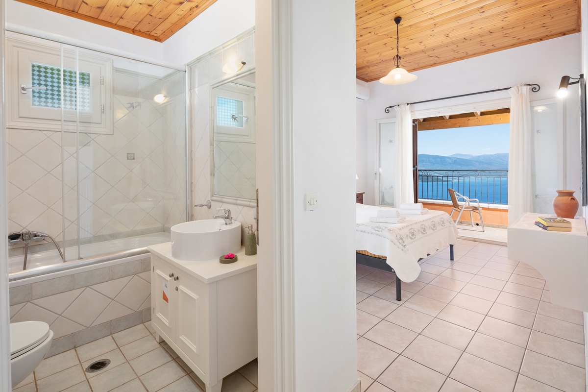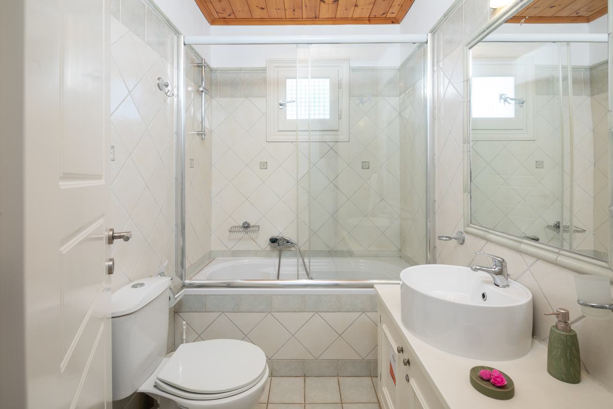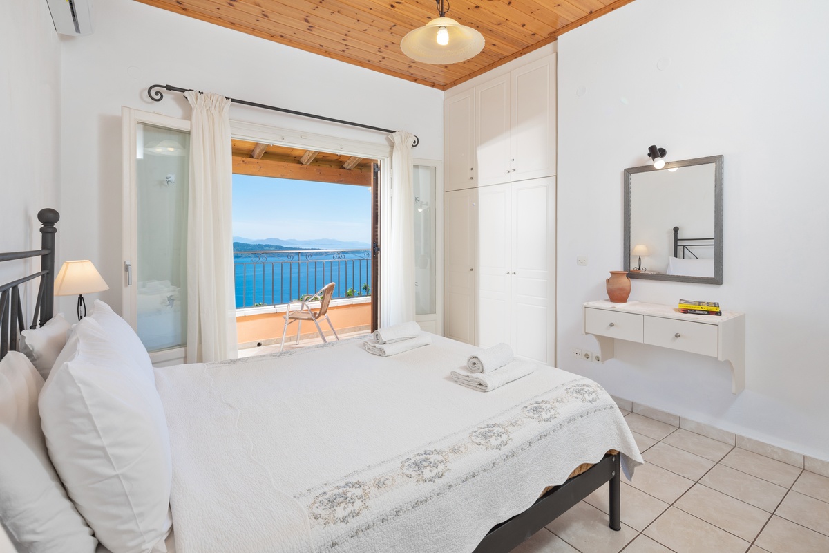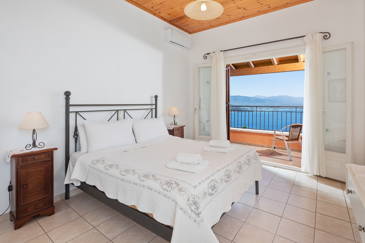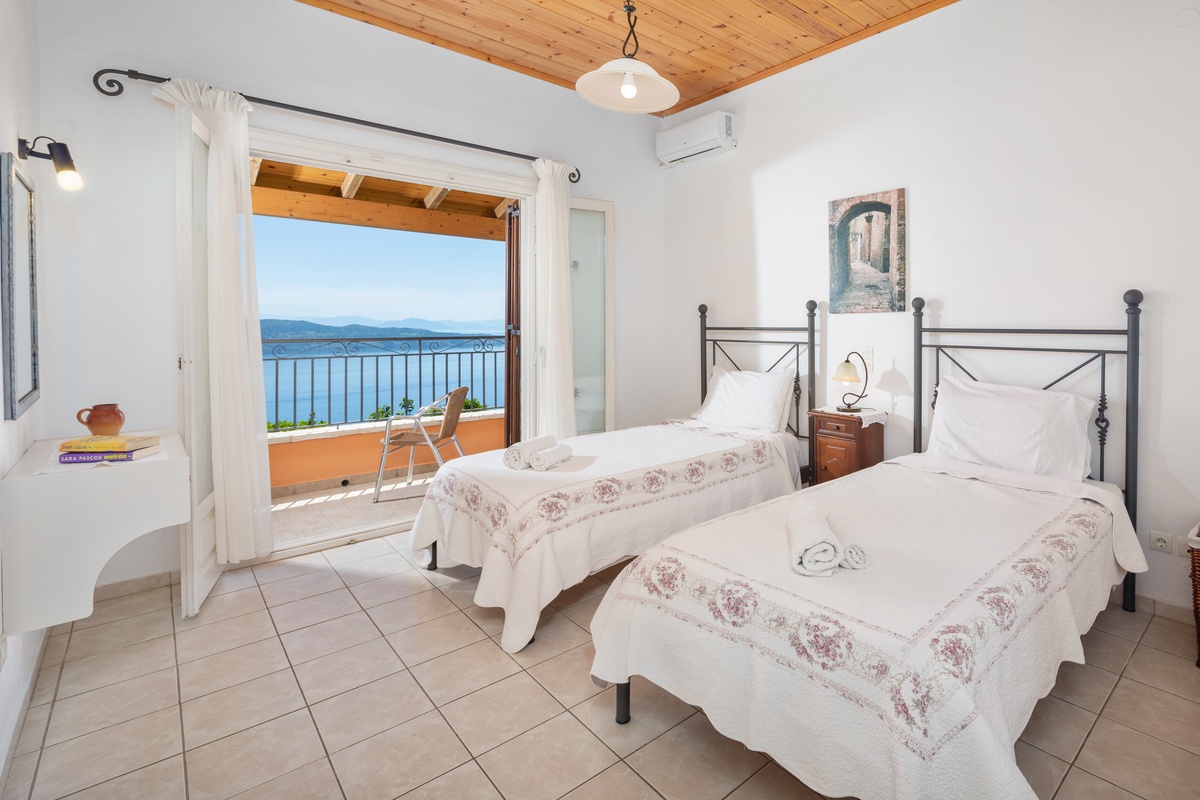Villa Andreas features two en suite bedrooms. One with a double bed and the other with twin beds. Both rooms open onto a shared balcony, creating a peaceful space to wake up or wind down.