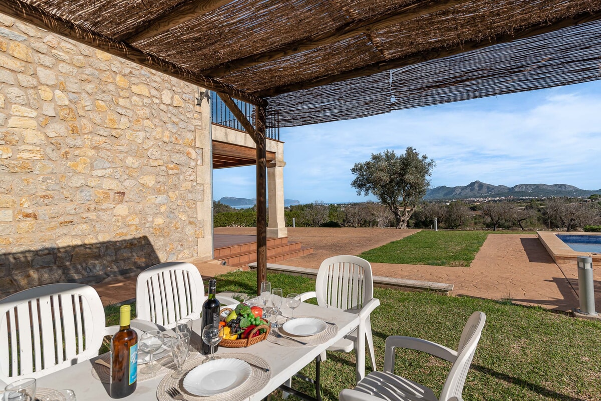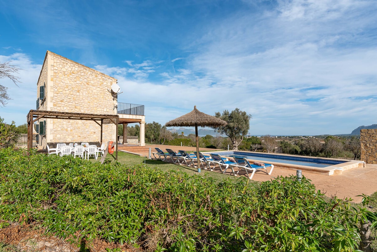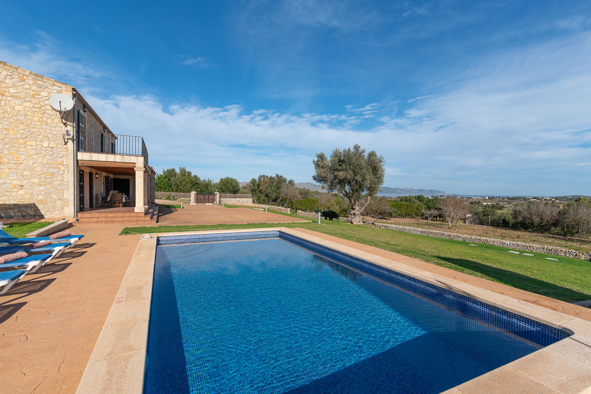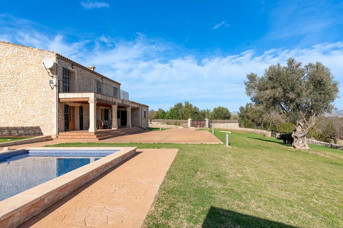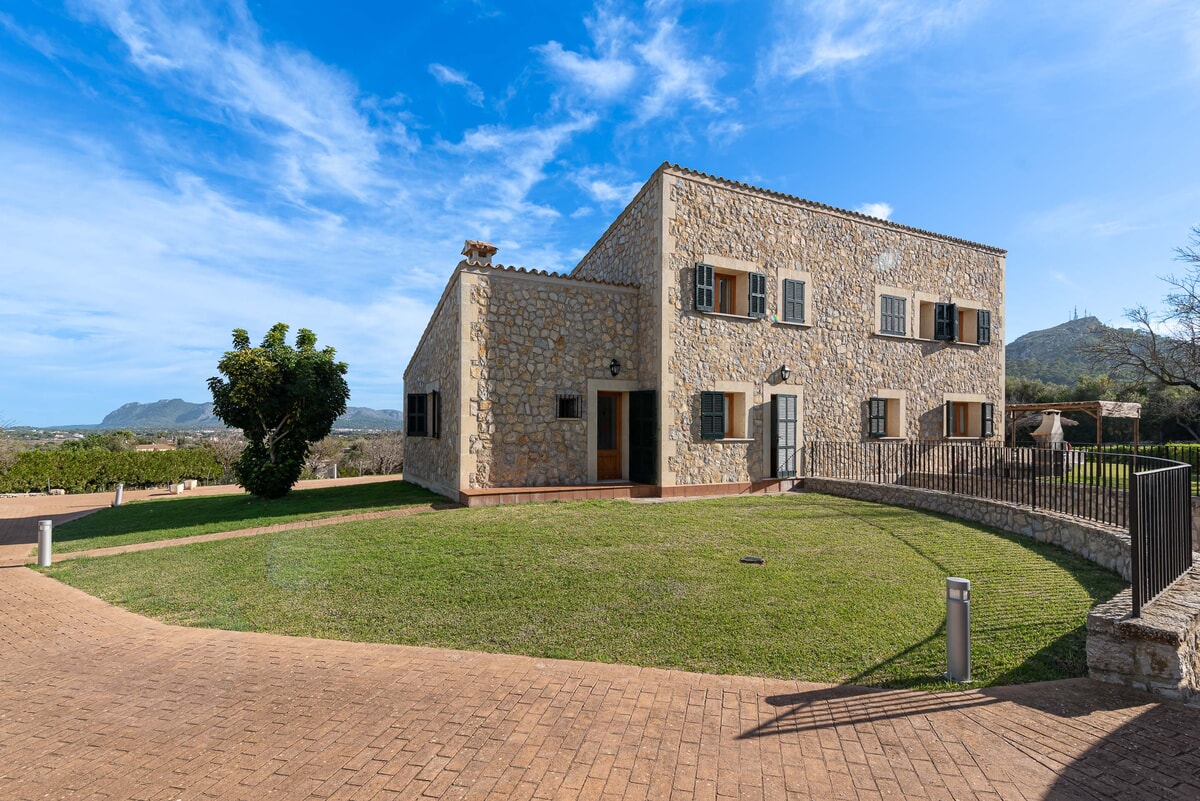 Can Baussana, a Mallorcan farmhouse with private swimming pool and extensive grounds. This traditional stone villa enjoys fabulous views across fields, olive groves, and mountains.