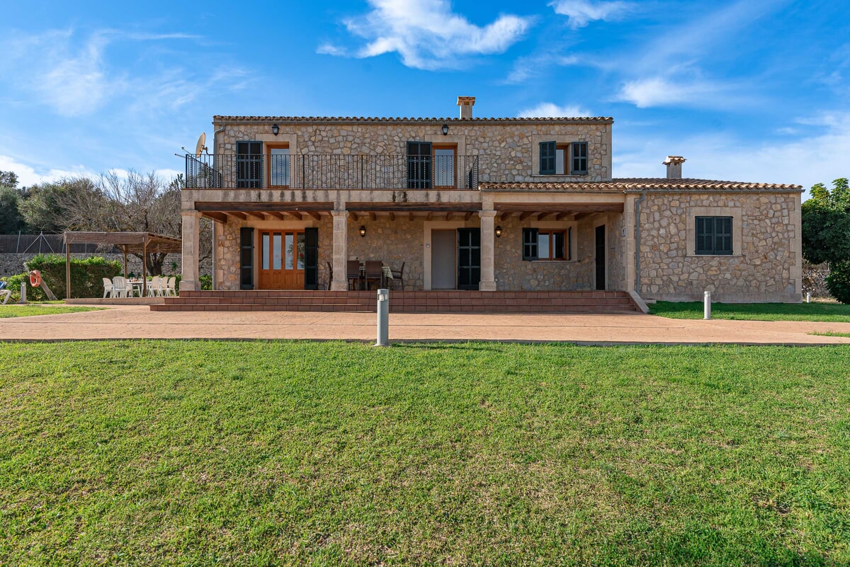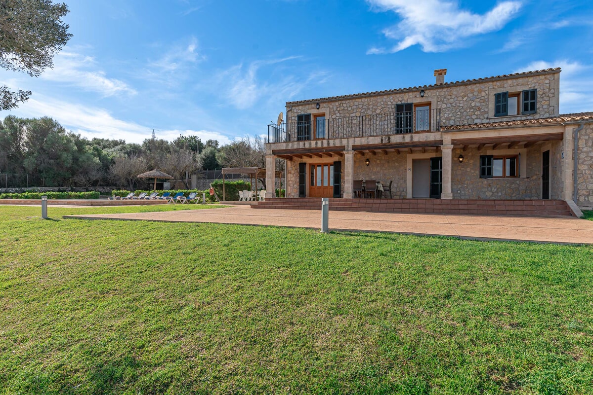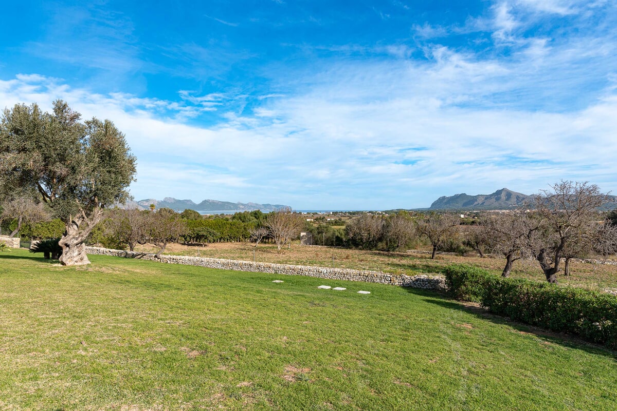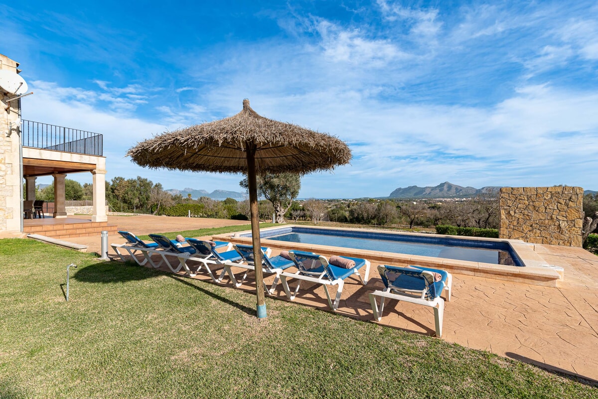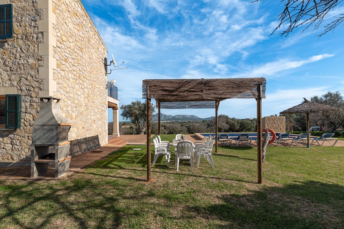 Can Baussana, a Mallorcan farmhouse with private swimming pool and extensive grounds. This traditional stone villa enjoys fabulous views across fields, olive groves, and mountains.