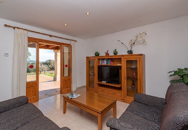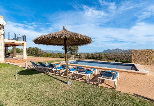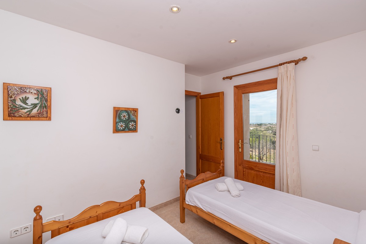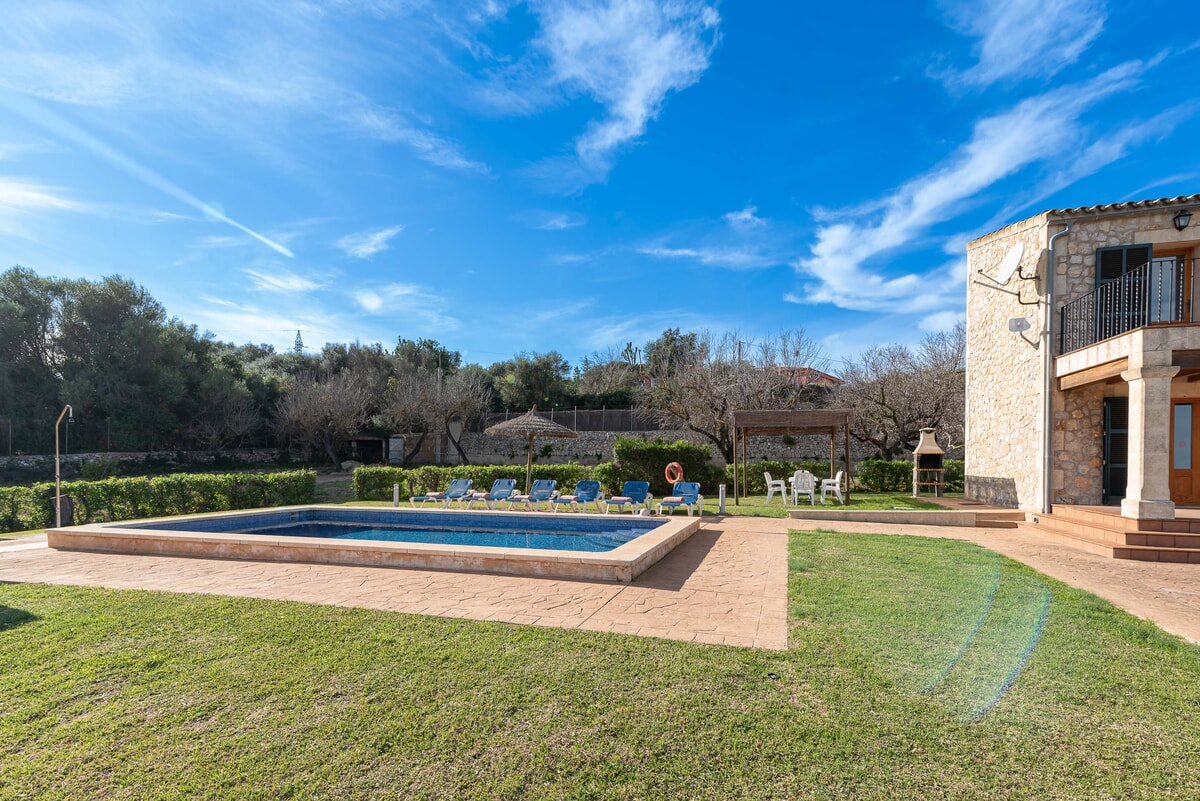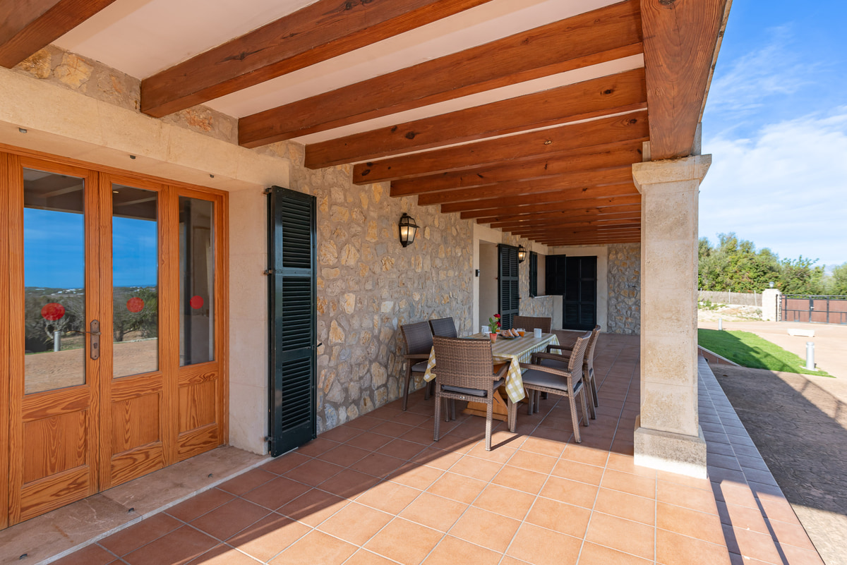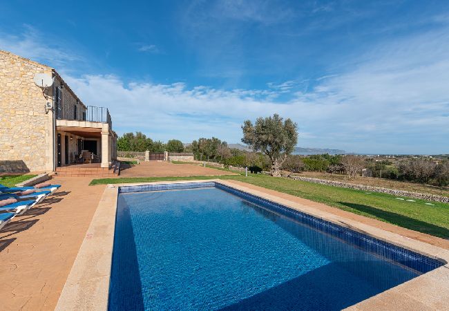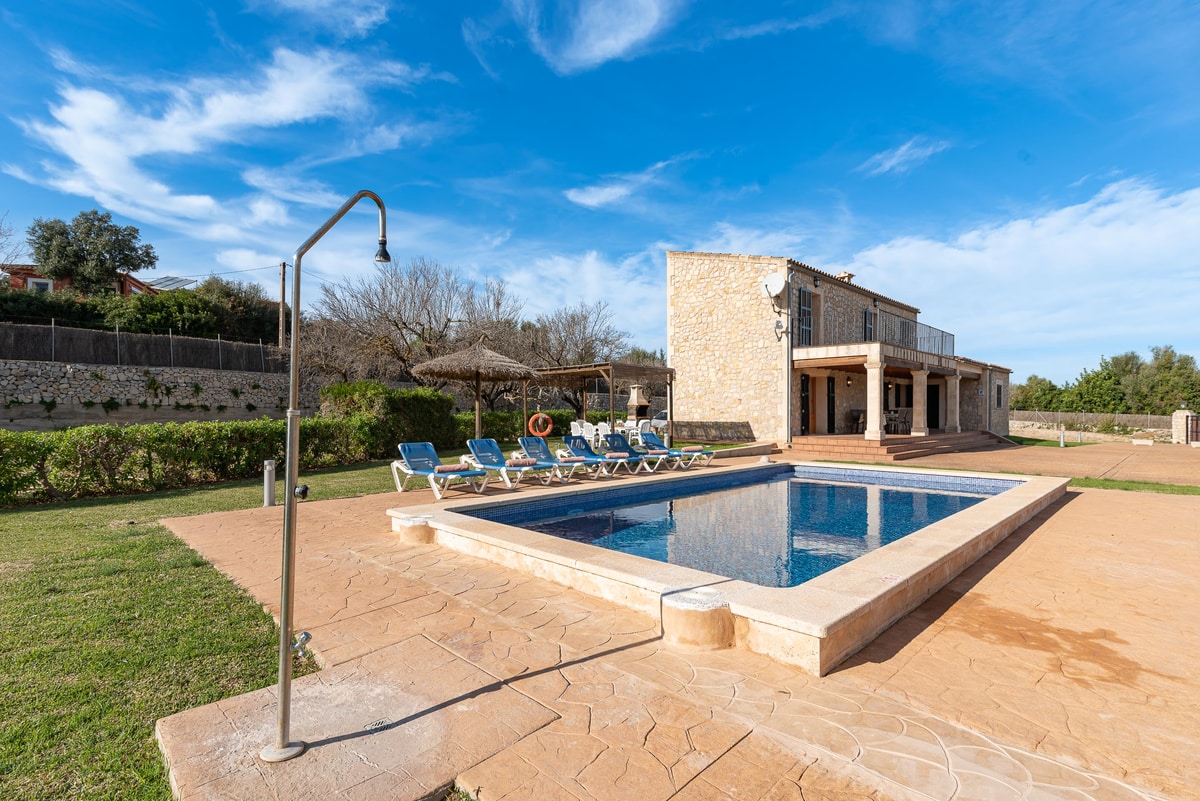 Can Baussana, a Mallorcan farmhouse with private swimming pool and extensive grounds. This traditional stone villa enjoys fabulous views across fields, olive groves, and mountains.